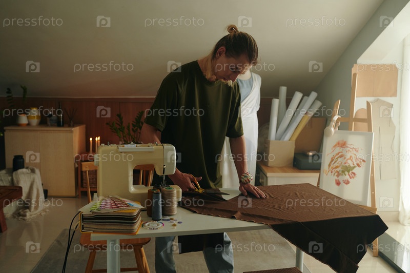 Модный дизайнер режет платье для коллекции