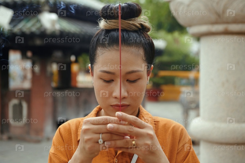 Женщина, молящаяся с ароматической палочкой