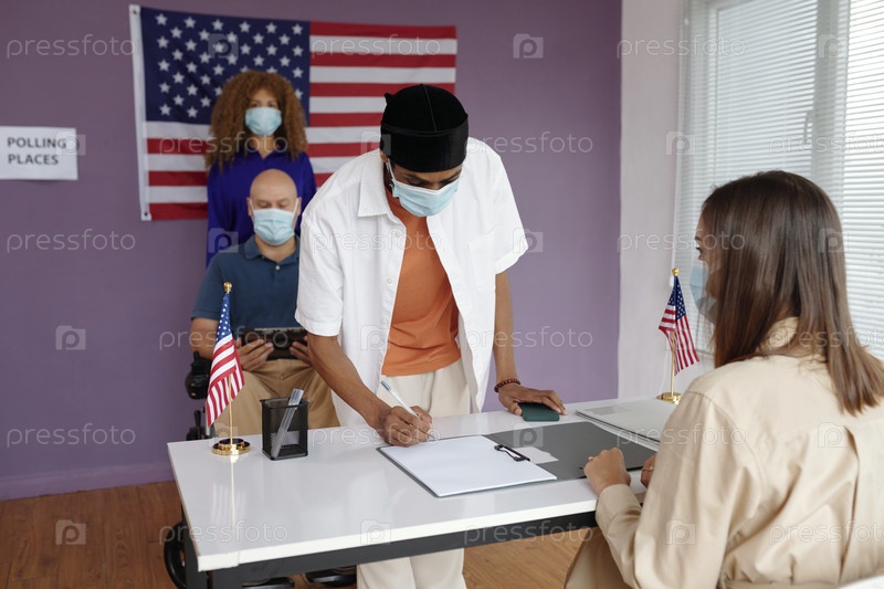 Человек в маске регистрируется перед тем, как проголосовать