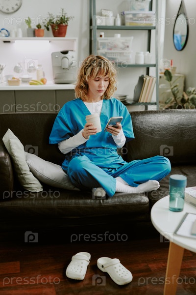 Медсестра пьет кофе и серфирует по интернету