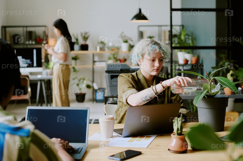 Женщина, поливающая растения на рабочем месте В офисе
