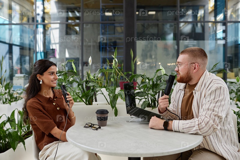 Улыбающийся мужчина и женщина разговаривают во время записи подкаста в кафе с растениями