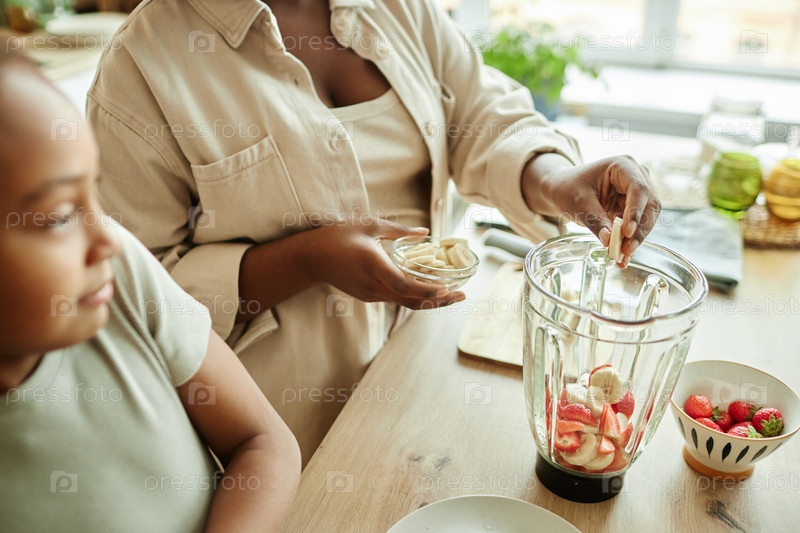 Черная женщина добавляет банан в блендер на кухне