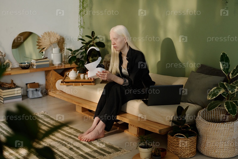 Белокожая женщина с VR-гарнитурой в гостиной