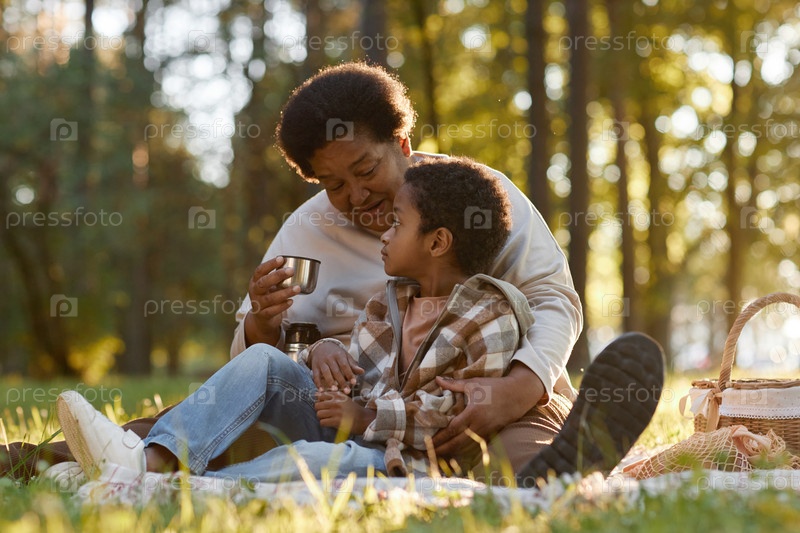 Бабушка и внук пьют горячий чай