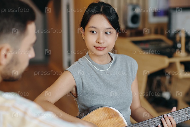 Играя на акустической гитаре с другом в уютной комнате