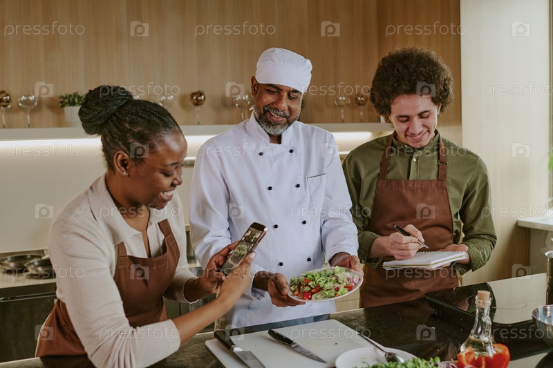Африкано-американский повар фотографирует салат