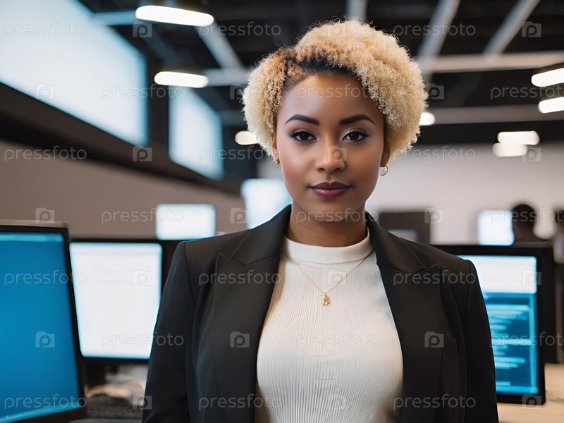 Портрет уверенной афроамериканской женщины, стоящей в офисе
