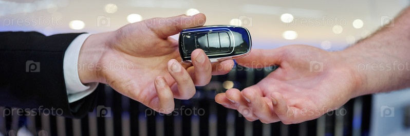 Автодилер передает ключ мужскому клиенту в автосалоне