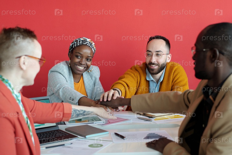 Разнообразные команды празднуют успех, складывая руки в офисе