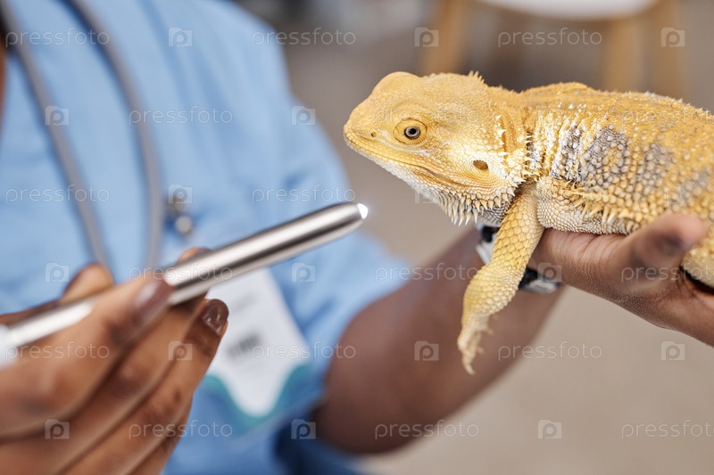 Эксперт, оценивающий чешуйчатую кожу рептилии с помощью фонарика Vet