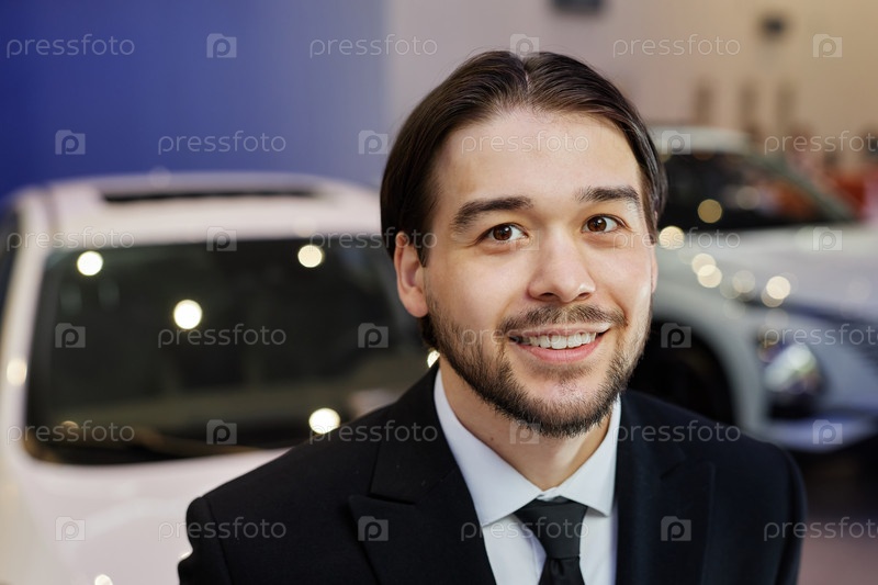 Портрет улыбающегося азиатского автодилера в автомобильном дилерском центре
