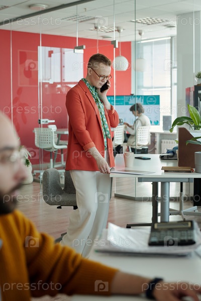 Женщина, разговаривающая со смартфоном в современном офисе