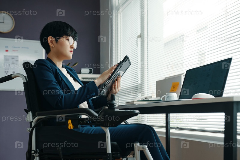 Деловая женщина с инвалидностью, работающая на планшетном ПК