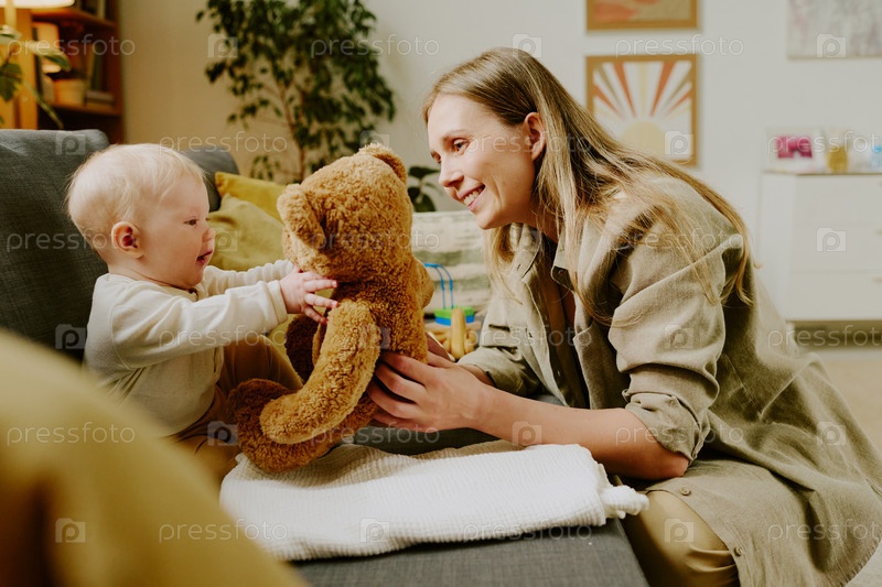 Улыбающаяся мать играет с ребенком, который держит медведя