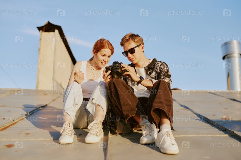Улыбающаяся пара проверяет фотографии на камеру на открытом воздухе