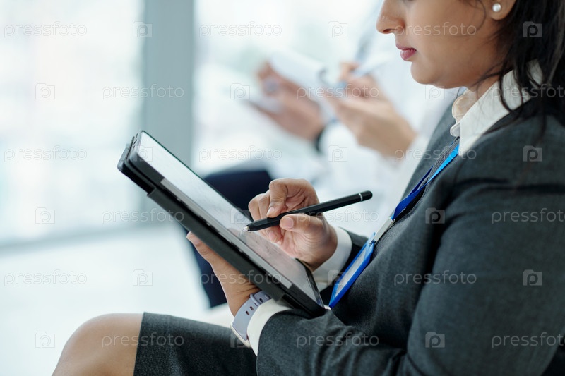 Деловая женщина, использующая планшетный компьютер на конференции