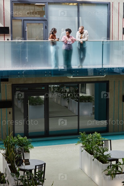 Разнообразная группа коллег беседует, стоя на втором этаже бизнес-здания