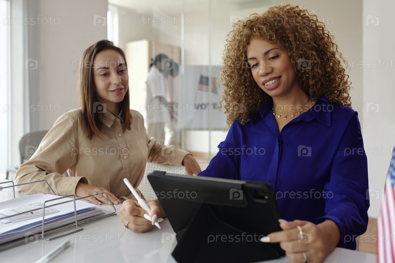 Женщина, использующая планшетный компьютер для голосования в Интернете
