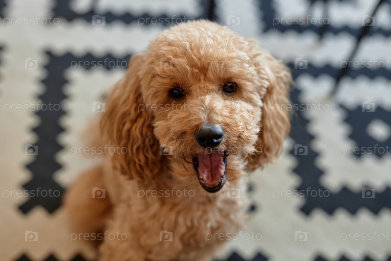 Улыбающийся игрушечный пудель, сидящий на ковре с геометрическим узором