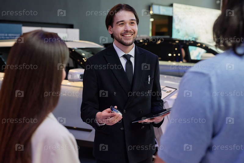 Улыбающийся мужчина автодилер с ключом продает автомобиль клиентам в дилерском центре