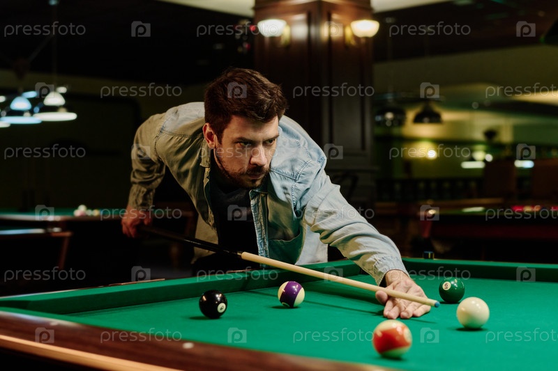 Человек, склонившийся над бильярдным столом во время игры