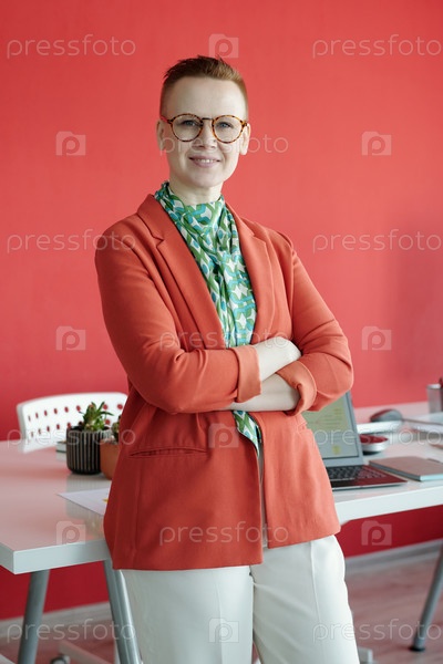 Портрет деловой женщины, улыбающейся в офисной обстановке