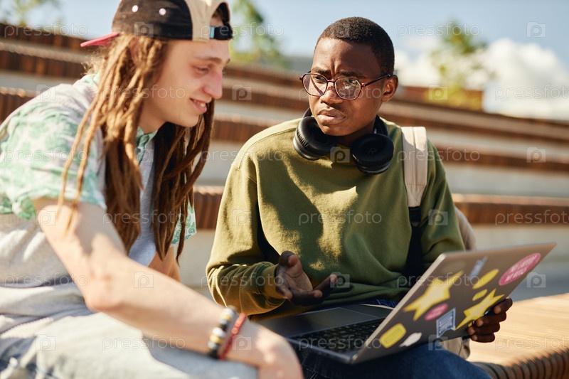 Нахмурившийся подросток с другом-мужчиной использует ноутбук на скамейке в парке