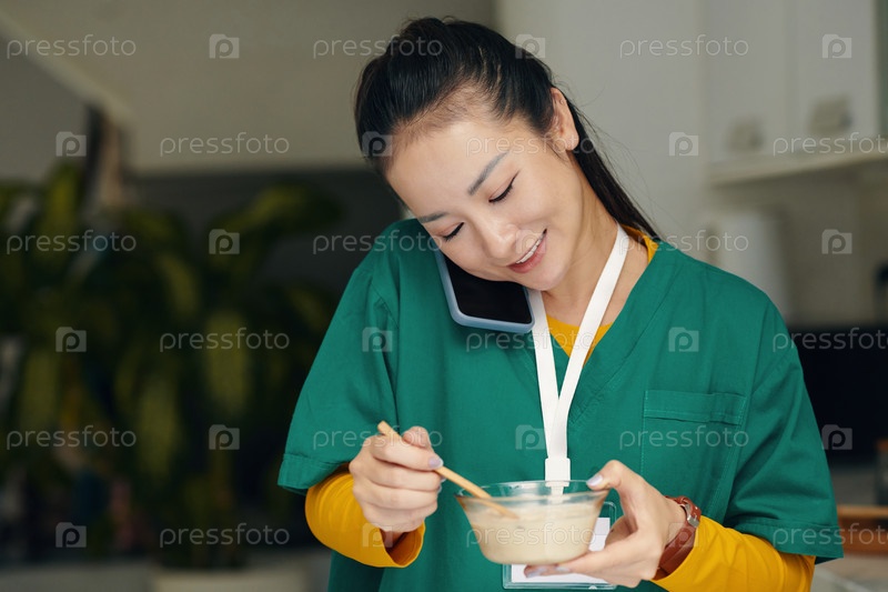 Улыбающаяся медсестра готовит завтрак на занятой кухне