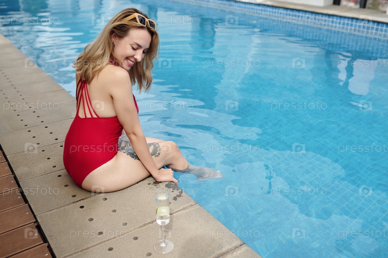 Расслабляясь у бассейна в красном купальном костюме, держащем бокал напитка