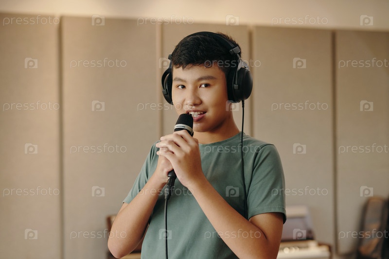 Петь и держать микрофон в студии звукозаписи с наушниками