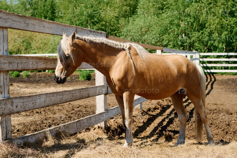 Пасущийся конь на солнечном пастбище с деревянным ограждением