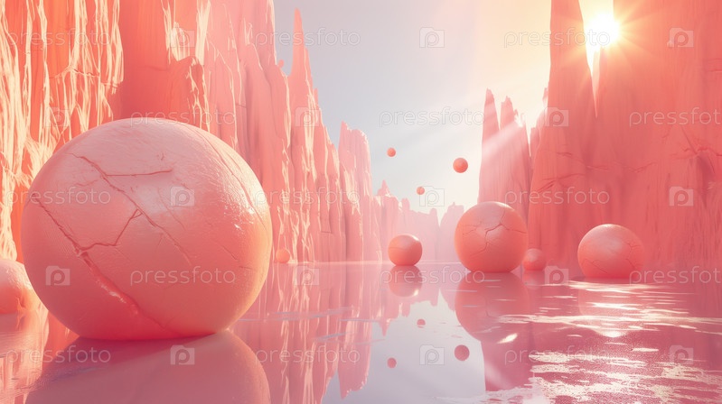 Мечтательный пейзаж с гигантскими розовыми яйцами на восходе солнца