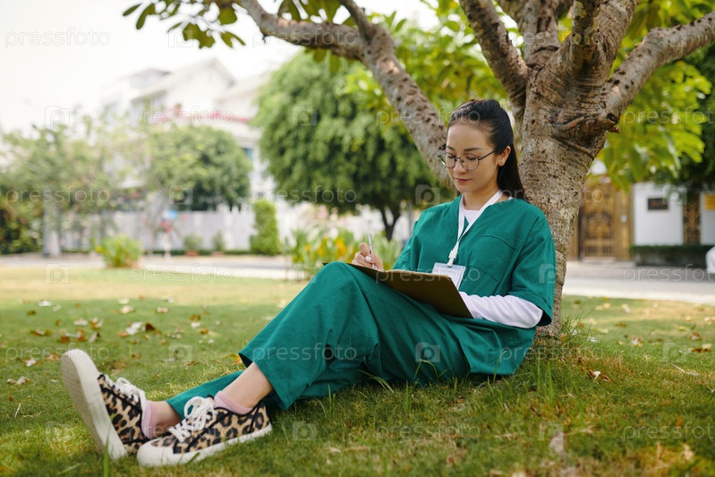 Медсестра в зеленых скрабах сидит под деревом, делая заметки
