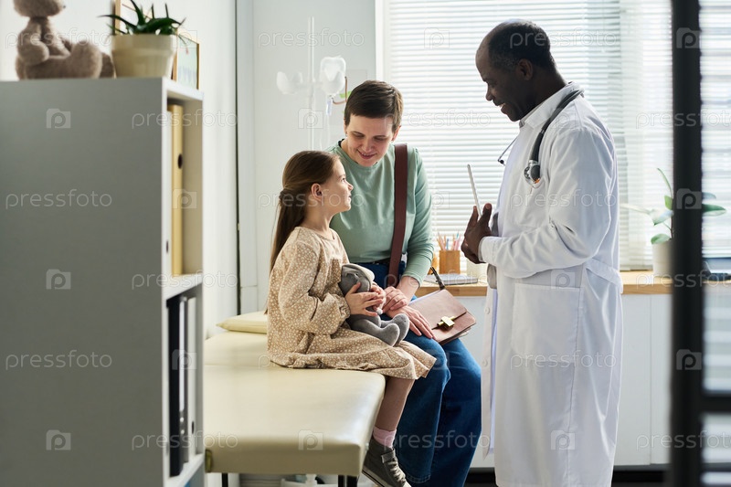 Врач разговаривает с ребенком и родителем в комнате клиники