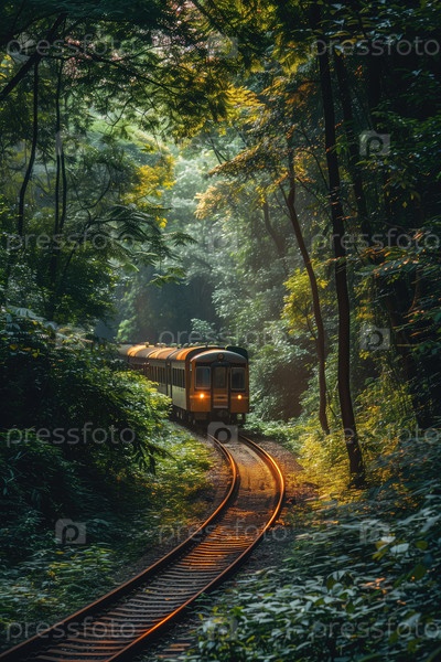 Поезд, проходящий через пышную зеленую лесистую область
