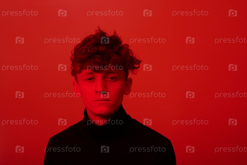 Портрет молодого человека на красном фоне с серьезным выражением