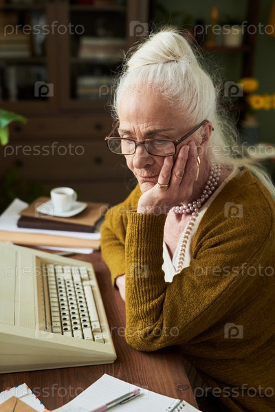 Пожилая женщина созерцает, сидя за рабочим столом