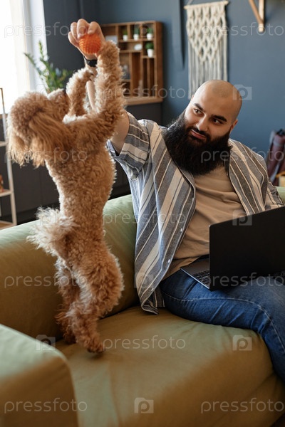 Мужчина работает, играя с собакой на домашнем диване