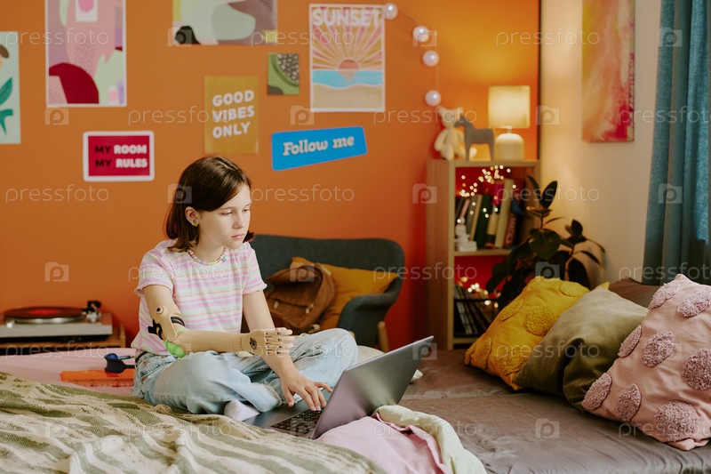 Девушка с инвалидностью отправляет текстовые сообщения на ноутбуке