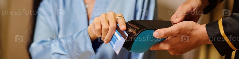 Женщина платит за обед в ресторане