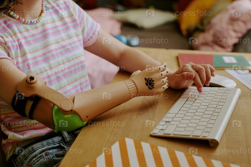 Непризнанная девочка с инвалидностью печатает на клавиатуре