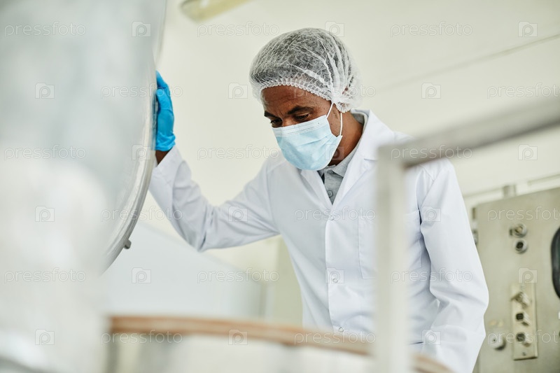 Техник по открыванию крышки маски Проверка производственного процесса на фармацевтической фабрике Мужчина