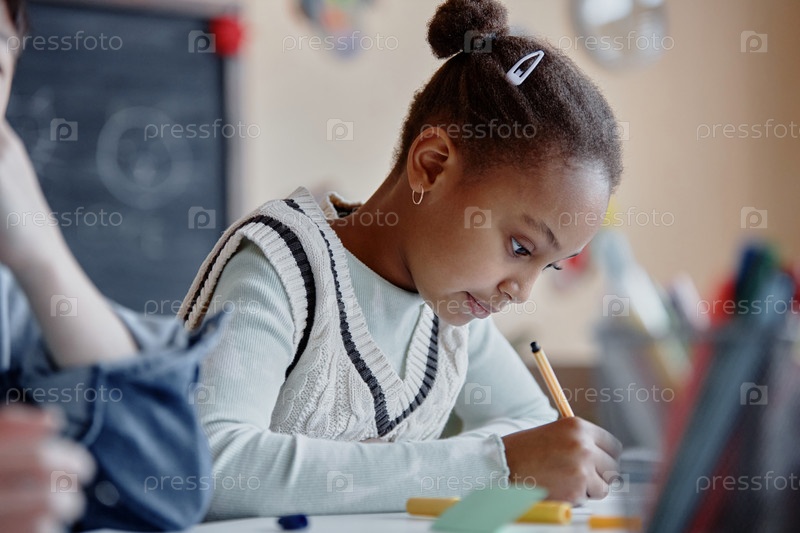 Студентка чернокожей этнической принадлежности учится на уроке