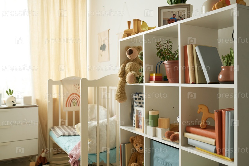 Аккуратно организованная игровая комната с книжными полками и игрушками
