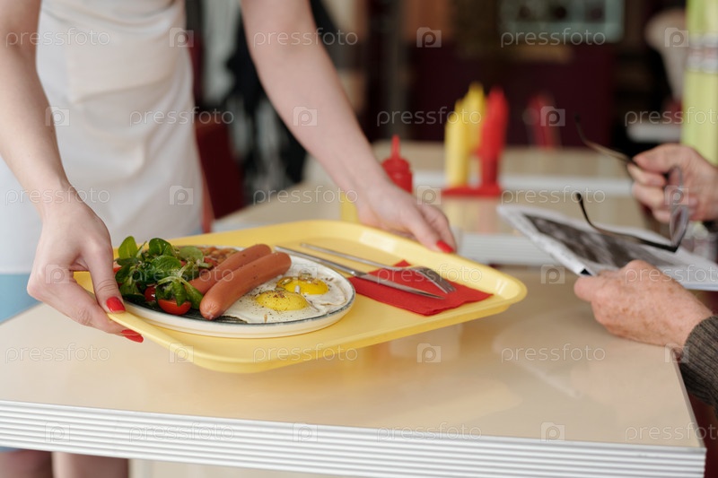 Сервировать тарелку с завтраком, содержащую колбасы и жареные яйца