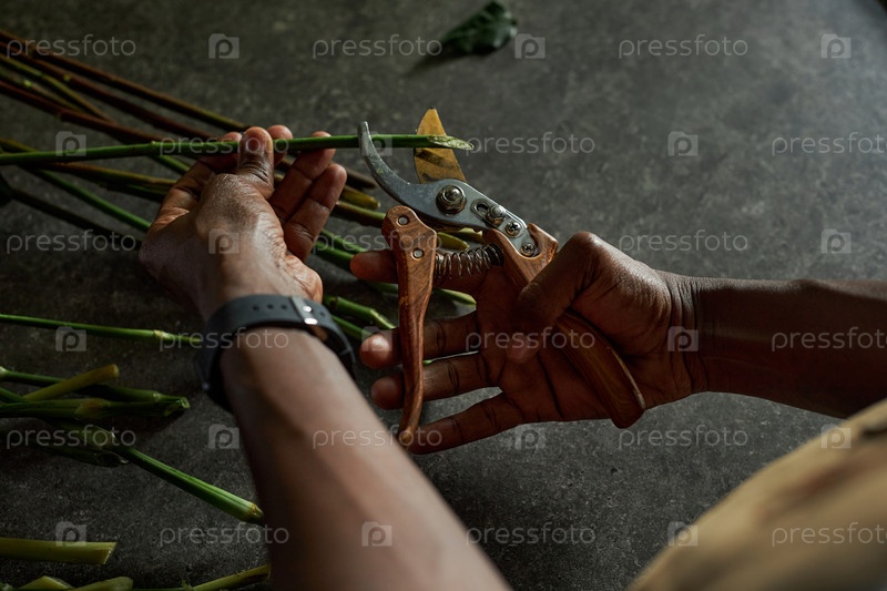 Мужские руки, режущие стебли цветов