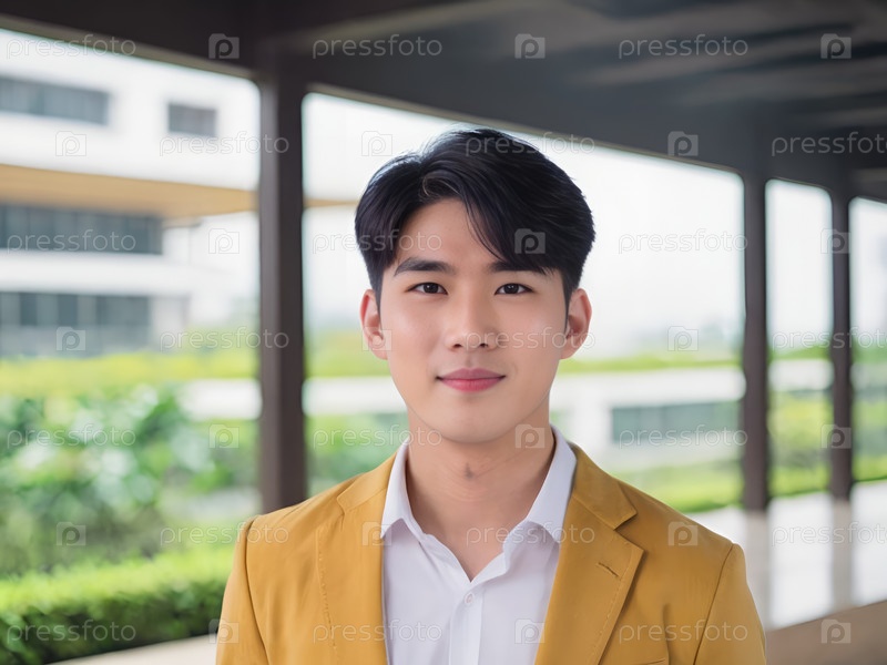 Портрет молодого азиатского мужчины, улыбающегося в ярком коридоре