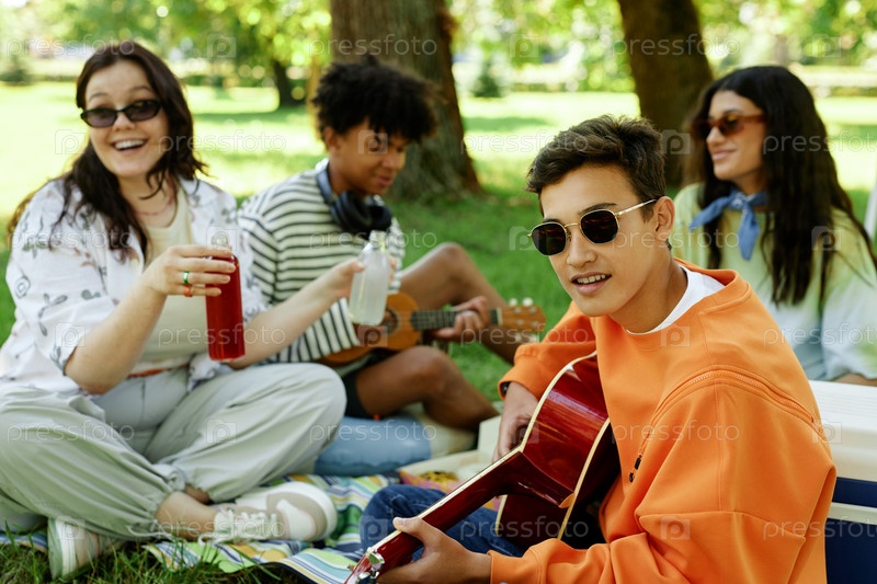 Подросток играет на гитаре поёт с друзьями, сидя на траве в парке