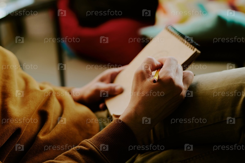 Руки человека рисуют в эскизной книжке